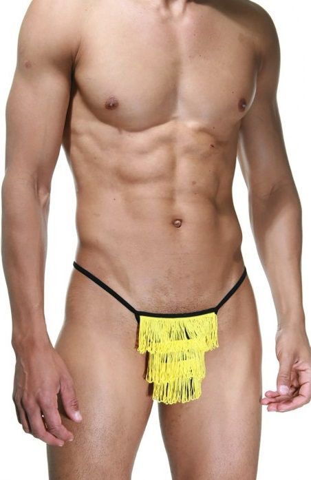 Трусы мужские на тоненьких резинках с яркой желтой бахромой, нашитой в три ряда.