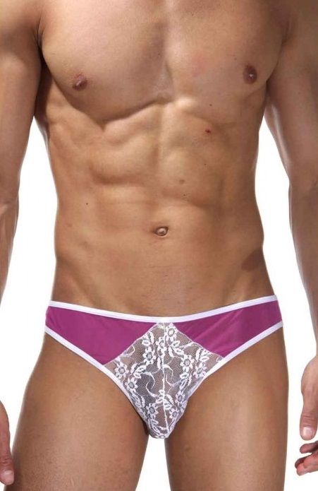 Мужские трусы-слипы, сшитые из сетки и контрастного кружева.
